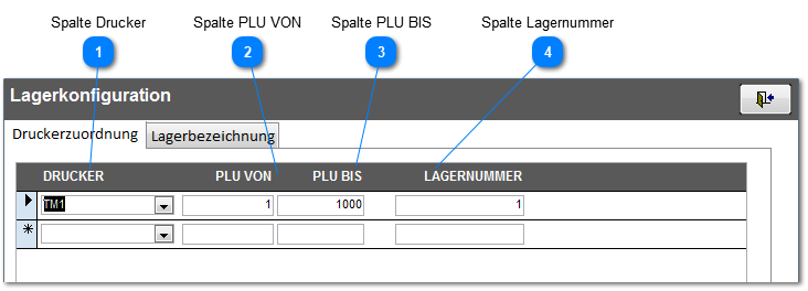 Jedem Bondrucker muss sein entsprechendes Lager zugeordnet sein. Zudem können dabei auch noch Artikelbereiche spezifiziert werden, um demselben Drucker verschiedene Lager zuordnen zu können. Dazu wird der Windows-Druckernamen des Bondruckers, die PLU der betroffenen Verkaufsartikel und die Ziel-Lagernummer ausgewählt. Im einfachsten Fall, mit einem einzigen Lager, stehen hier alle Drucker untereinander, mit jeweils dem kompletten PLU-Bereich und mit der Lagernummer 1.